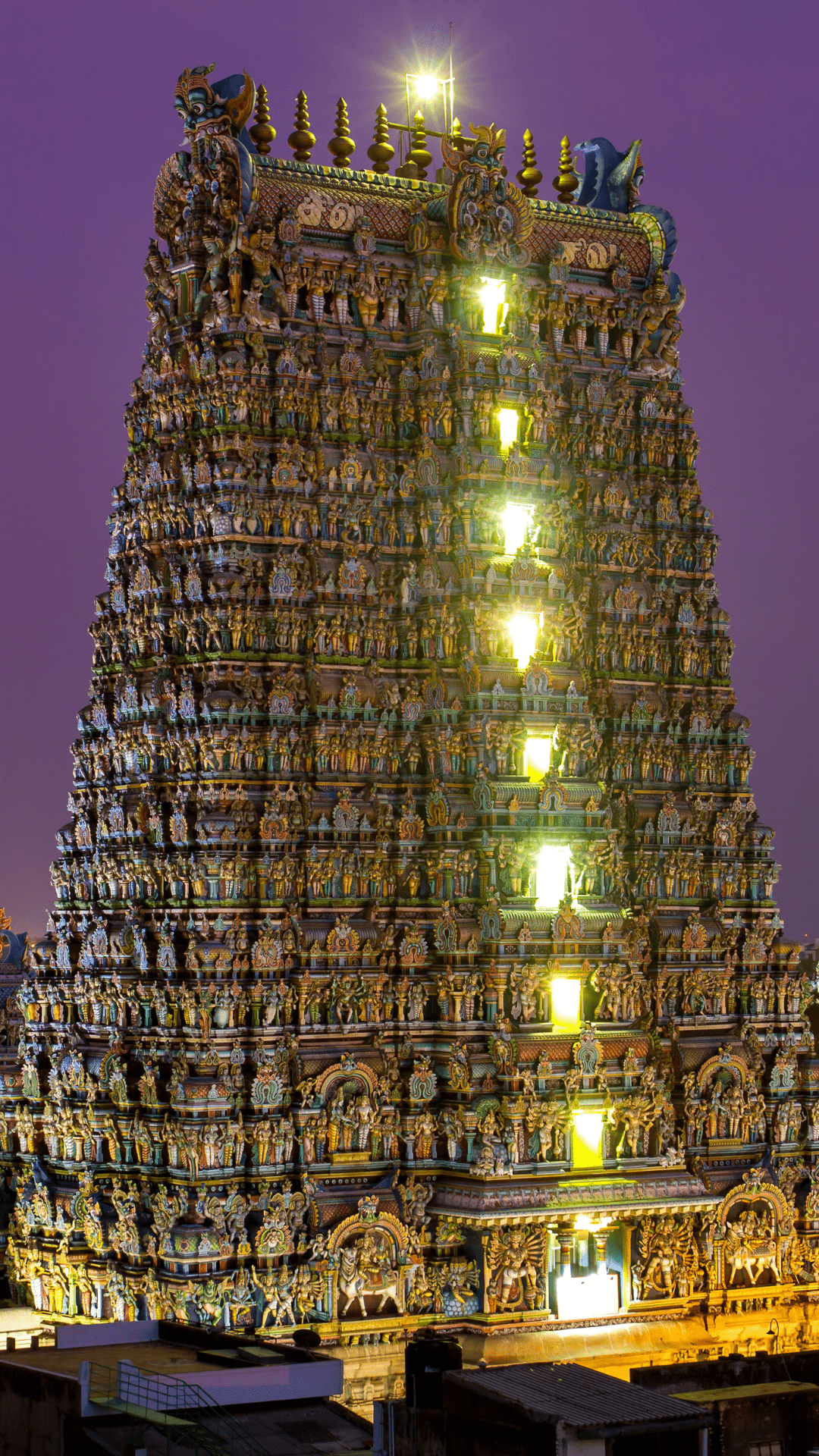 A magnificent Hindu temple with intricate sculptures and vibrant Dravidian architecture.